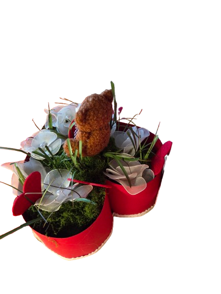 Décoration fleurs cœur verdure et un joli petit nounours sur le dessus.