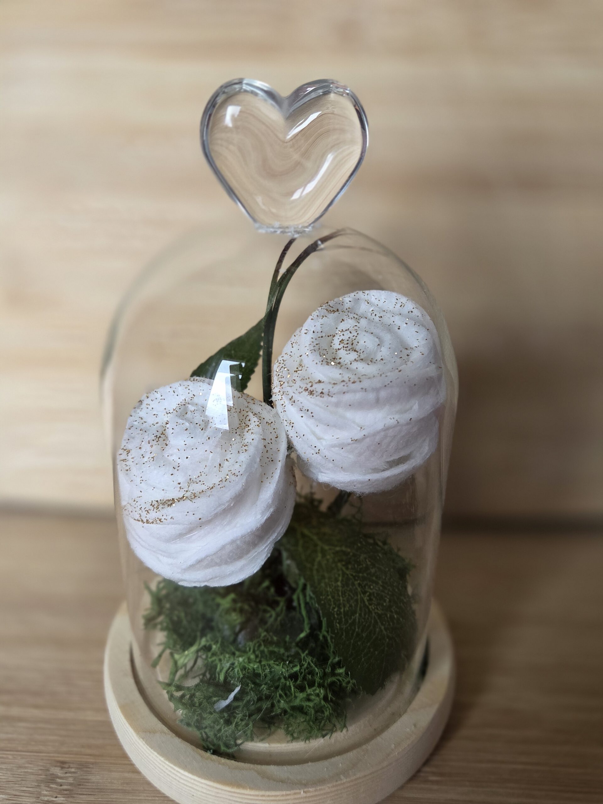 Dôme rn verre avec socle en bois et un petit cœur sur le dessus.
