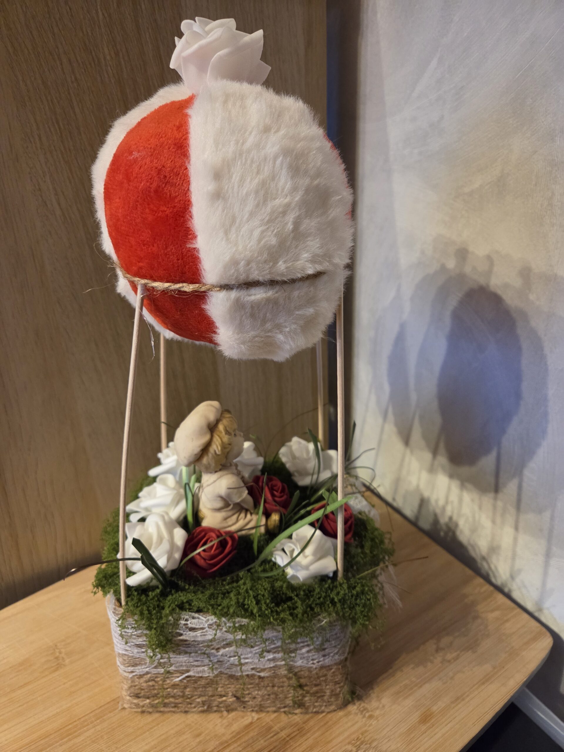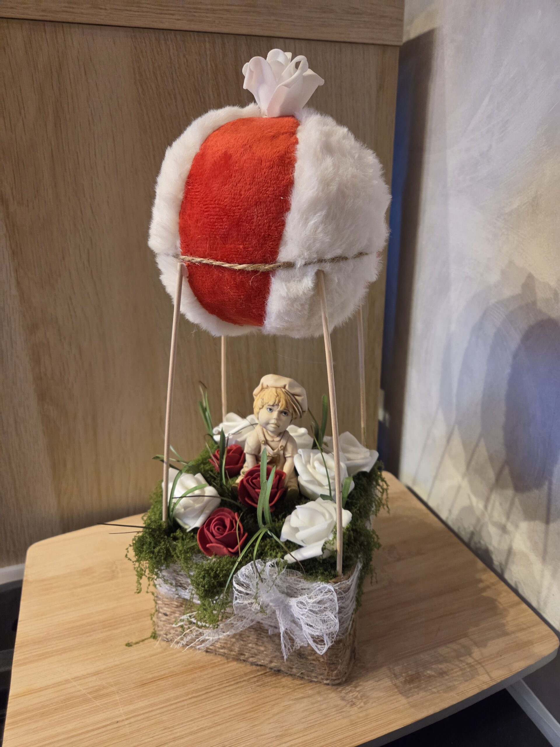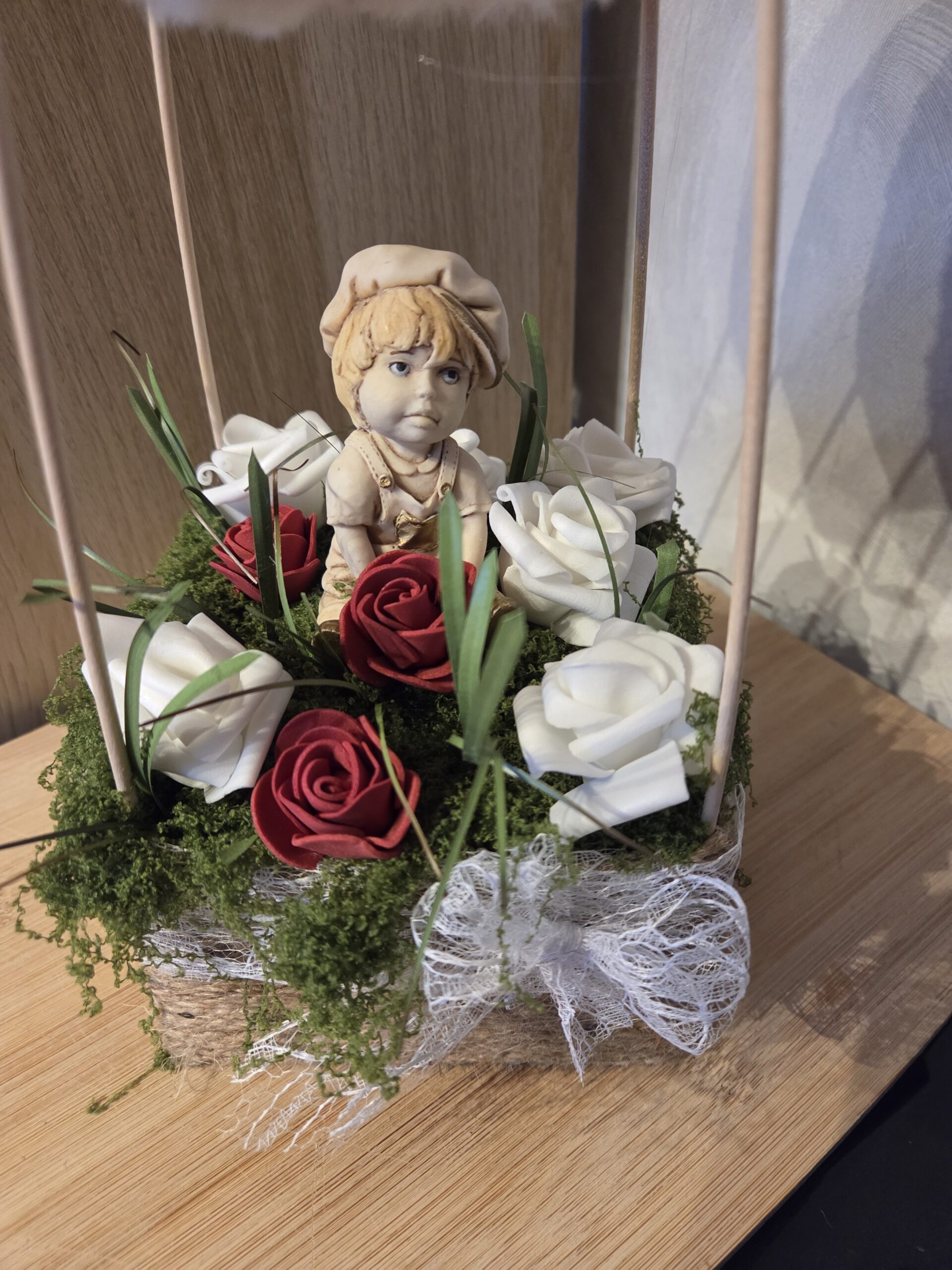 Panier carré fleuri , au milieu vous trouverez un joli petit garçon.