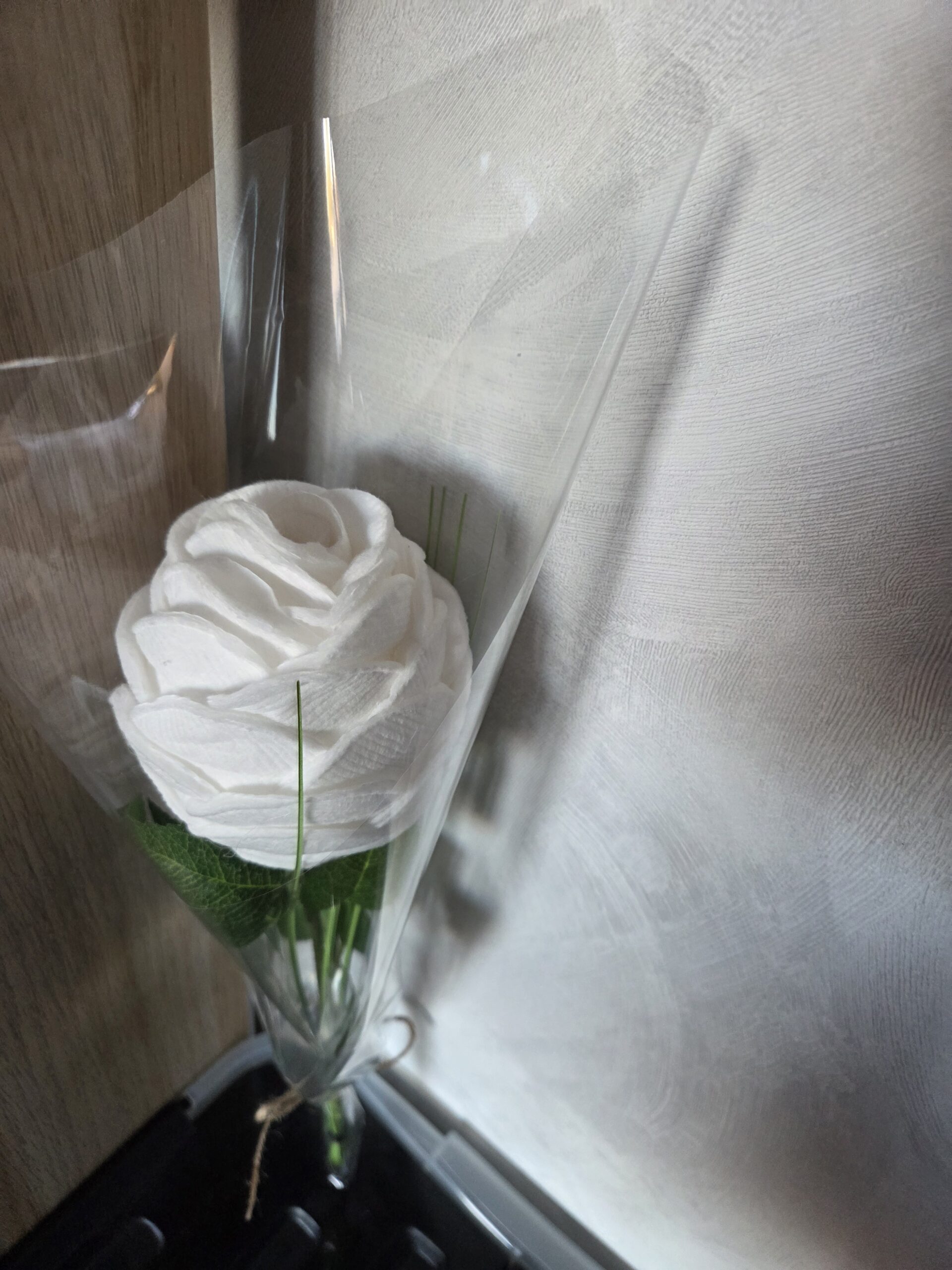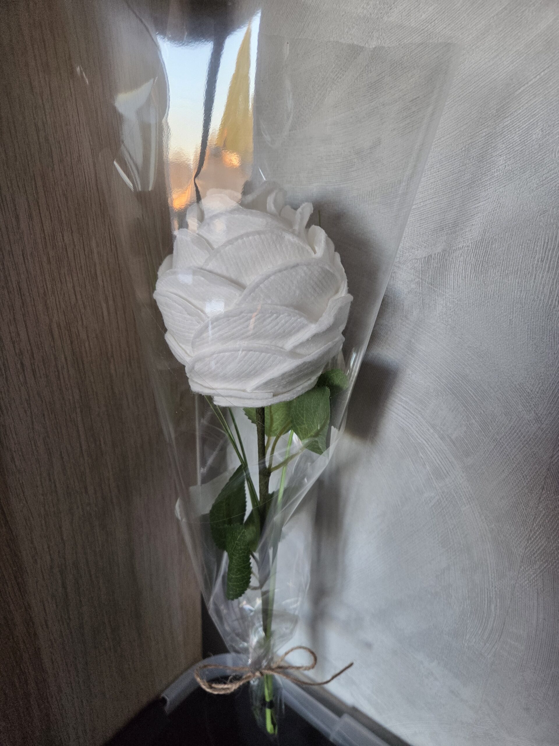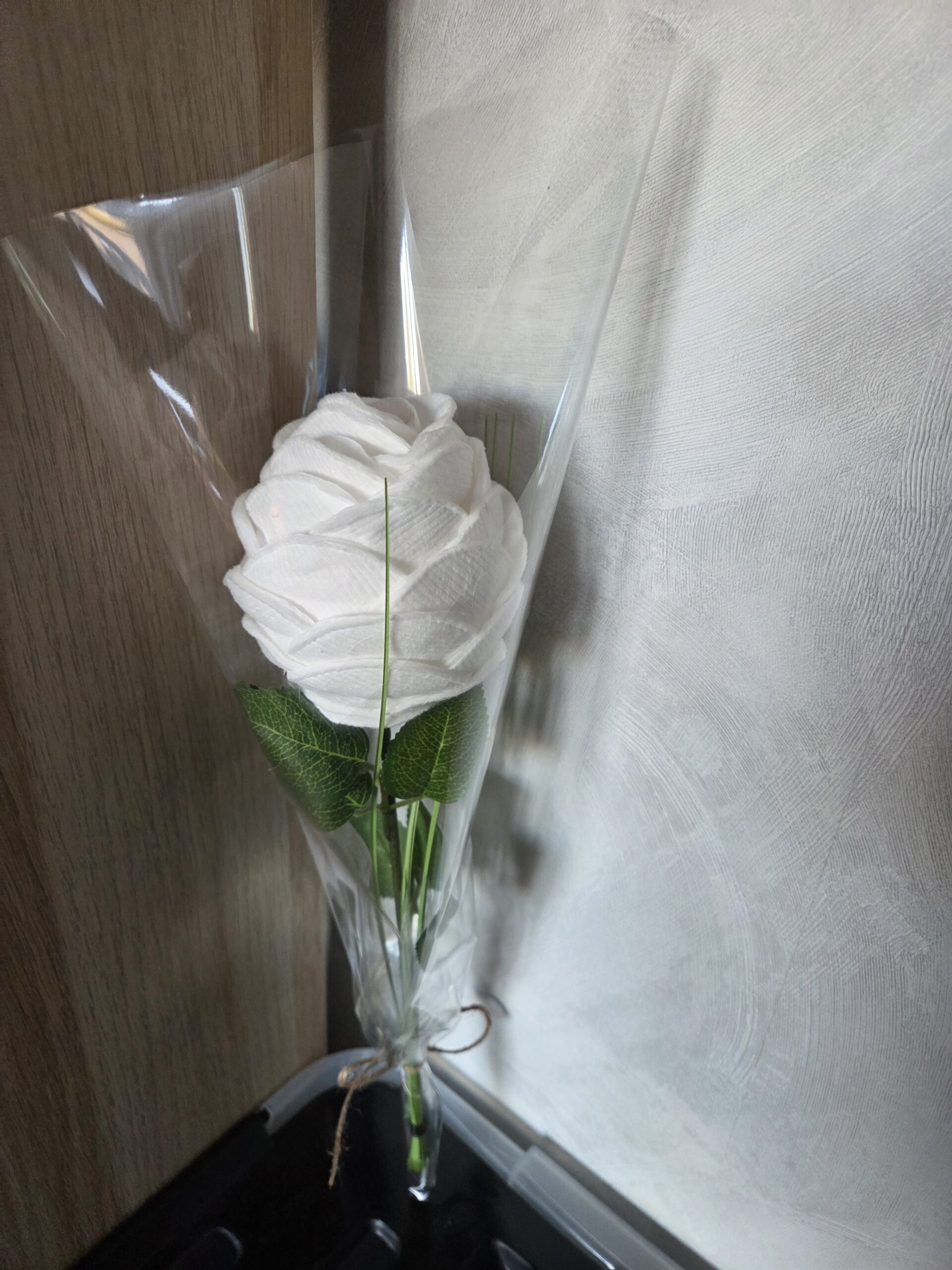 Rose blanche sur un bâton rigide quelques feuilles et des brindilles vertes.